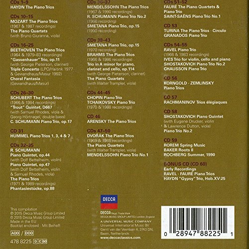 Die einmalige Edition enthält jeweils die kompletten Klaviertrio-Zyklen von Haydn, Mozart, Beethoven, Schubert, Brahms und Dvorák. Andere Höhepunkte sind die legendären Aufnahmen von Beethovens Tripel-Konzert und Trios von Ravel, Chopin, Korngold und Rachmaninoff.